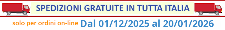 Chiusura in occasione del Natale 2025: gli ordini in pronta consegna saranno evasi nel mese di dicembre solo se pervenuti entro venerdì 12 dicembre 2025; per gli altri ordini di articoli che non sono in pronta consegna effettuati dopo il 28/11/2025 dove si richiedono almeno 15 gg. lavorativi, consegneremo fino al 18/12/2025. Tutte le consegne riprenderanno poi dal 15/01/2026.